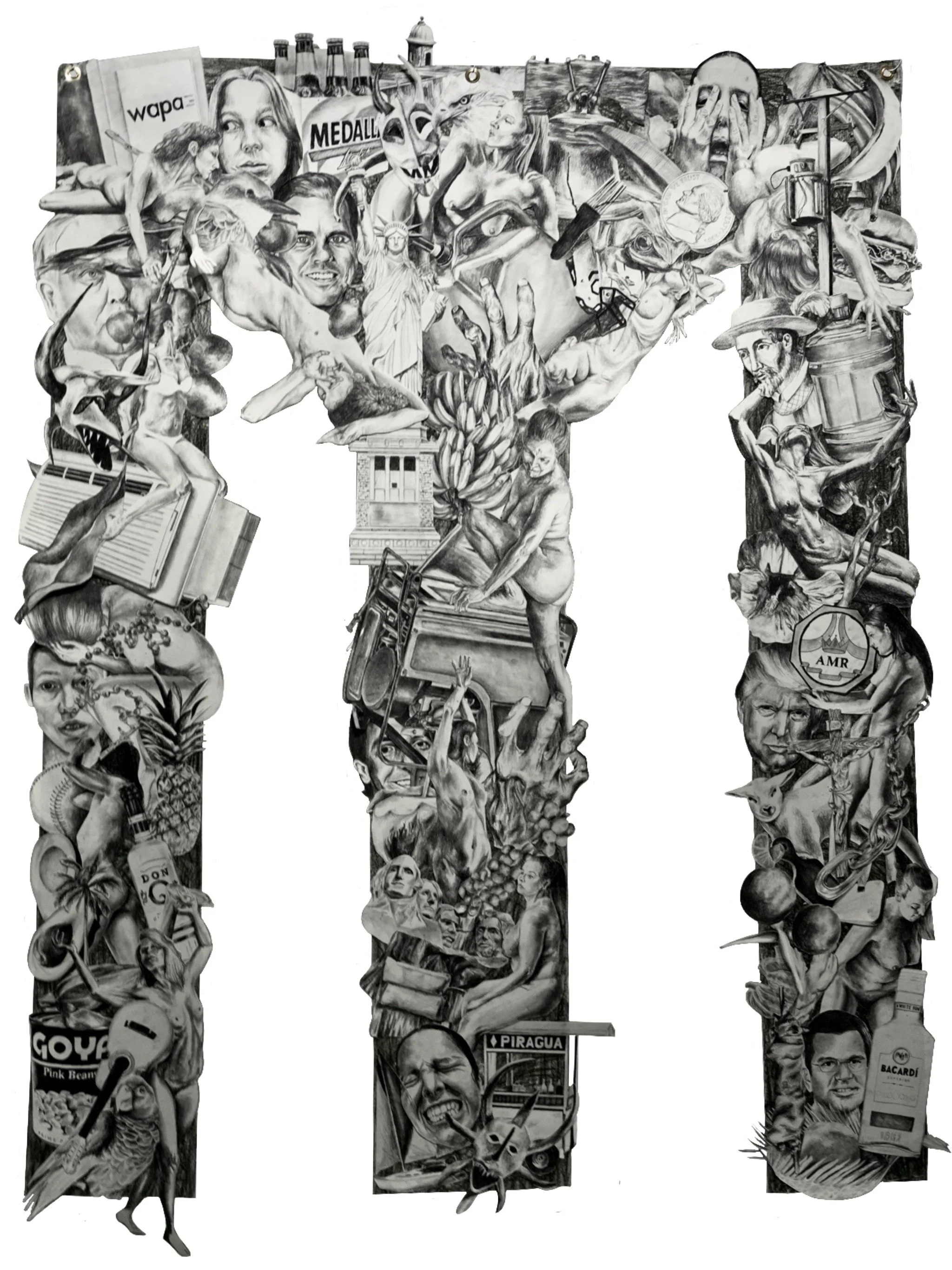 The piece consists of over 80 graphite illustrations, each serving a specific purpose in placement and relationship to each other. The amalgamation of objects, bodies and faces make for a chaotically loud display; the drawings feature a variety of symbols ranging from classic Puerto Rican dishes to visualizations of colonialism in association with the United States. The contorted, nude model drawings displayed sporadically across the piece serve as embodiments of my struggles with identity, the detailed muscle contractions perfectly reflect the underlying tension within myself. Posing as a black and white flag, the piece serves not to represent the island, but to represent my personal resistance with identity.